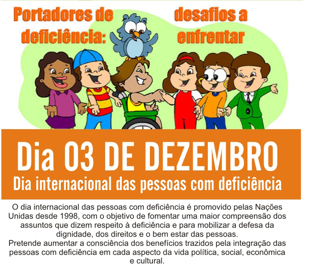 Comemorou-se ontem o Dia Internacional das Pessoas com Deficiência (ou Portadoras de Deficiência). Sendo um dia de especial importância e porque no Agrupamento de Escolas Afonso de Paiva existem crianças portadoras de deficiência, o Departamento do Ensino Especial realizou um Sarau feito para e por essas mesmas crianças. Em breve teremos aqui notícias de como decorreu essa atividade.